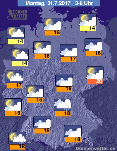 In der folgenden Nacht bilden sich im Süden zunächst noch verbreitet Schauer und mögliche Gewitter, aber auch sonst ist es teils stark, teils aber auch aufgelockert bewölkt, dazu allerdings weitgehend trocken. Die Temperatur sinkt auf tropische 20 Grad in Dresden und bis 14 Grad entlang der Ems.