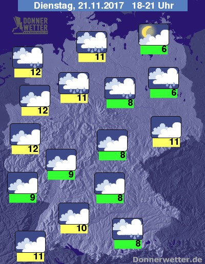 Heute Abend sind im Ostseeumfeld Auflockerungen möglich, sonst halten sich jedoch weitgehend dichte Wolken und im Norden und Osten fällt auch häufig Regen, sonst bleibt es hingegen weitgehend trocken. Die Temperatur liegt bei 6 bis 12 Grad.