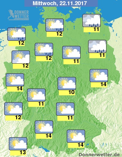 Am Mittwoch bleibt es im Norden und Nordosten überwiegend stark bewölkt und es fällt hier zeitweise Regen. Im übrigen Bundesgebiet zeigt sich das Wetter oft locker bis aufgelockert bewölkt, im Tagesverlauf sogar oft sonnig, dabei bleibt es trocken. Die Temperatur steigt auf milde 10 bis 14 Grad.