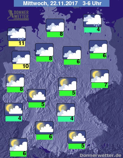 In der Nacht zum Mittwoch lockert die Bewölkung über der Südhälfte meist etwas auf, hier bleibt es trocken. Dagegen halten sich über dem Norden dichte Wolken und es fällt auch zeitweise Regen. Die Temperatur sinkt auf 11 bis 4 Grad.