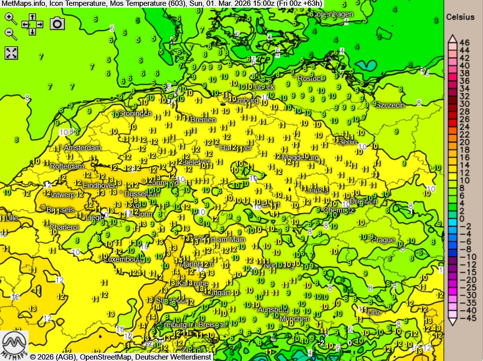 Die Temperaturen erreichen am Höchstwerte um 10 Grad im Norden und um 15 Grad am Niederrhein.