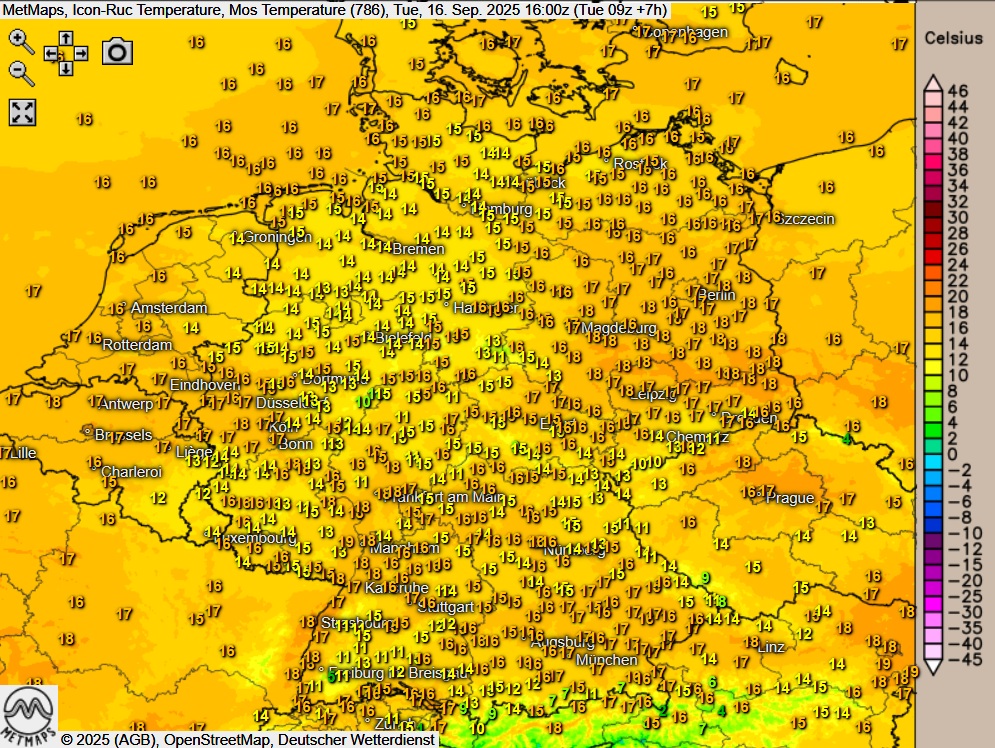 Von Westen her kommt im Nachmittagsverlauf zudem Regen auf, der sich im weiteren Verlauf bis in die Landesmitte ausweitet. In den übrigen Landesteilen überwiegt am Nachmittag wechselnde oder aufgelockerte Bewölkung und es bleibt meist trocken.