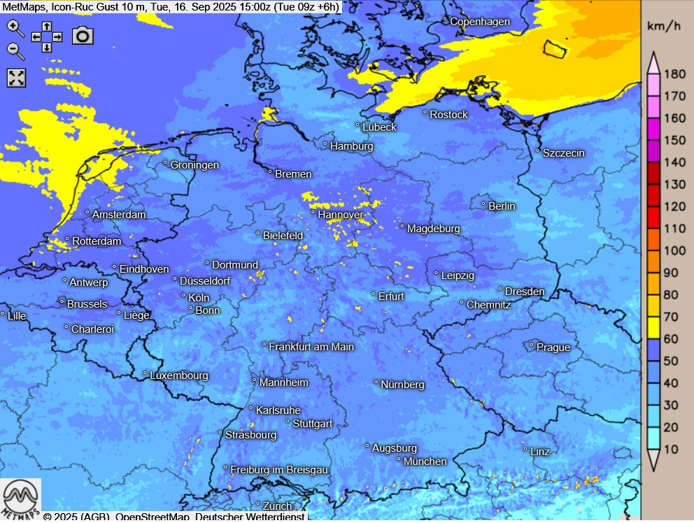 Die Lufttemperaturen am Dienstagnachmittag (16:00 Uhr) sowie die Böenkarte (15:00 Uhr) nach Icon-Ruc: