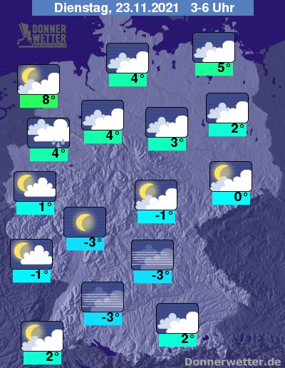 In der kommenden Nacht fällt an den Alpen unter dichten Wolken noch gebietsweise Regen oder Schnee. Auch von der Nordsee ziehen dichte Wolken mit möglichen Regenfällen bis in den Nordwesten des Landes. Im übrigen Land ist es teils gering, teils stark bewölkt, dazu bleibt es trocken. Stellenweise kann sich Nebel bilden. Die Temperatur sinkt auf 8 Grad an der Nordsee und bis -3 Grad in Mittelfranken.