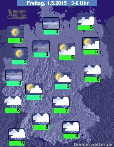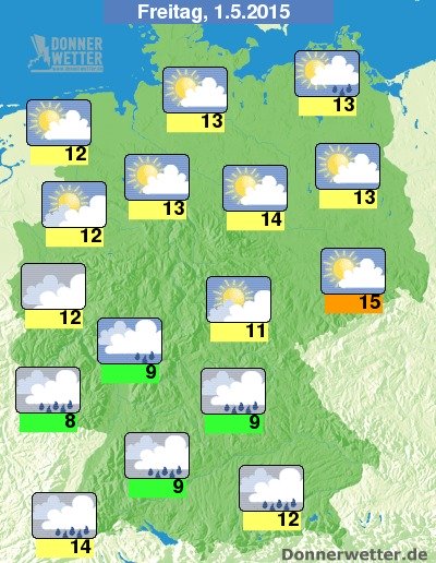 Am 1. Mai bleibt es über der Südhälfte Deutschlands bei meist dichten Wolken und im Süden selbst fällt zeitweise, und hierbei besonders am Alpenrand teils langanhaltender und ergiebiger Regen. In den nördlicher gelegenen Landesteilen scheint hingegen zu Beginn häufig die Sonne, im Tagesverlauf ziehen aber auch hier zunehmend Wolken auf, dabei bilden sich im Ostseeumfeld einige Schauer, sonst bleibt es hingegen trocken. Die Temperatur steigt auf teils nur 8 Grad am Pfälzer Wald und bis 15 Grad in der Lausitz.