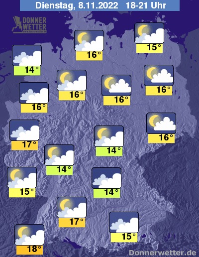 Heute Abend ist es verbreitet aufgelockert bis stark bewölkt, im Osten ist es auch noch oft gering bis wechselnd bewölkt. Es bleibt zunächst landesweit trocken, im weiteren Verlauf setzt im Südwesten jedoch Regen ein. Die Temperatur liegt bei 14 Grad in Cuxhaven und etwa 18 Grad in Freiburg. An der Nordsee weht ein oft stürmischer Wind.