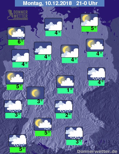 In den späten Abendstunden zeigt sich der Himmel meist bedeckt oder aufgelockert bewölkt, vor allem in der Süd- und Westhälfte muss zudem immer wieder mit Regen- oder Schneeregen, südlich den Mains auch teils mit Schneeschauern gerechnet werden.
