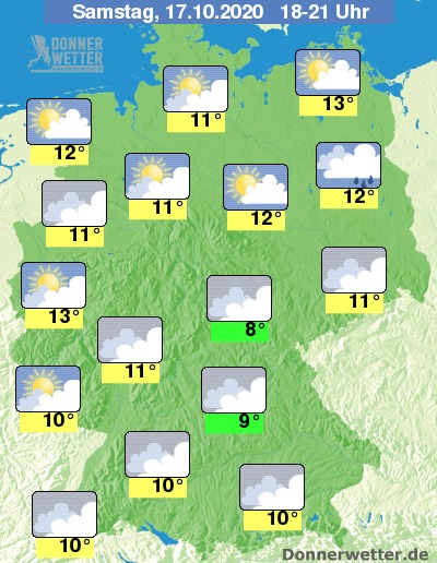 Heute Abend klingen auch im Osten letzte Schauer rasch ab, es bleibt aber oft stark bewölkt. Besonders im Norden und Westen ist es aber auch oft aufgelockert und zum Teil nur locker bewölkt. Die Temperatur liegt bei etwa 8 Grad im Grabfeld und bis 13 Grad in der Kölner Bucht.