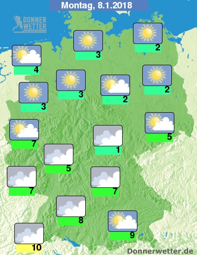 Vor allem im Norden strahlt nach frostiger Nacht für längere Zeit die Sonne. Sonst dominieren meistens die Wolken und lassen nur regional einige Sonnenstrahlen durch. Allerdings sollte es nahezu überall im Lande trocken bleiben. Die Höchsttemperaturen liegen zwischen 1 und 4 Grad im Norden, sonst werden 4 bis 8, im Breisgau auch nahe 10 Grad erreicht. Ein spürbarer Nordost- bis Ostwind lässt einem die Luft aber kälter empfinden.
