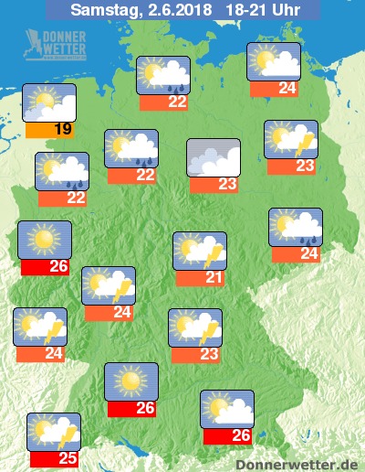 Heute Abend zeigt sich im Süden, jedoch auch im Westen oft die Sonne und es ziehen meist nur wenige Wolken durch, örtlich können sich allerdings auch teils kräftige Schauer und Gewitter entwickeln. Im übrigen Land ist es häufig stark, teils auch locker bewölkt und es sind sowohl Schauer als auch Gewitter möglich. Die Temperatur liegt bei 19 Grad in Cuxhaven und etwa 26 Grad in Stuttgart.