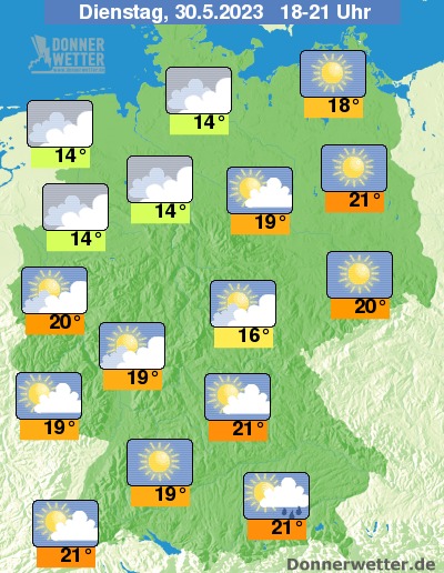 Heute Nachmittag ist es überwiegend heiter oder sonnig, vor allem im Norden und Westen ziehen allerdings einige, zum Teil auch dichte Wolken durch, dabei bleibt es weitgehend trocken. An den Alpen sind lokale Schauer jedoch möglich. Die Temperatur liegt bei nur 12 Grad in der Norddeutschen Tiefebene und etwa 21 Grad in Oberbayern.