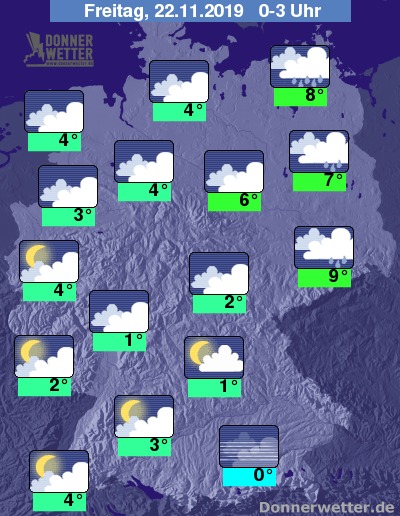 In der Nacht zeigt sich der Himmel über der Nordhälfte des Landes meist dicht bewölkt oder bedeckt, im Süden und Südosten überwiegt lockere oder aufgelockerte Bewölkung. Vor allem an den Alpen kann sich gebietsweise auch Nebel bilden. Bis auf einzelne Schauer entlang der Oder bleibt es in der Nacht trocken.
