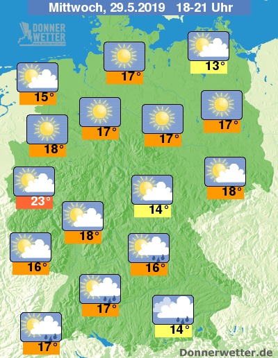 Die Temperaturen liegen am frühen Abend zwischen kühlen 13 Grad an der Ostsee und warmen 23 Grad rund um Köln.