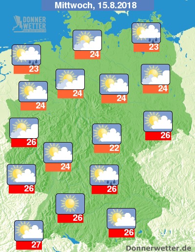 In Deutschland wechseln sich heute Sonne und Wolken miteinander ab. Vor allem im Norden kann es aus dichterer Bewölkung stellenweise noch etwas tröpfeln, sonst sollte es jedoch weitgehend trocken bleiben. Die Luft erwärmt sich bei einem meist nur noch schwachen bis mäßigen Wind auf angenehme Sommertemperaturen von 22 bis 28 Grad.