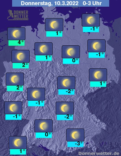 Die Temperaturen sinken im Nachtverlauf auf Werte um 3 Grad auf den ostfriesischen Inseln und -3 Grad am Alpenrand.