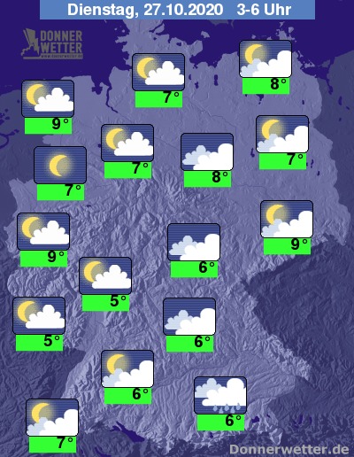 In der Nacht auf Dienstag zeigt sich der Himmel über weiten Landesteilen locker oder aufgelockert bewölkt, zwischen dem West-Havelland und dem Allgäu bleibt der Wolkendecke auch häufig geschlossen. Es bleibt meist trocken, nur am Alpenrand muss in der Nacht immer wieder mit Schauern gerechnet werden.