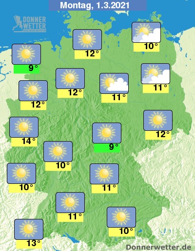 Heute scheint über der Bundesrepublik verbreitet die Sonne, lediglich im östlichen Brandenburg und Vorpommern sind mal einige Wolken möglich, dabei bleibt es trocken. Die Temperatur steigt auf 9 Grad an der Nordsee und bis 14 Grad in Köln.
