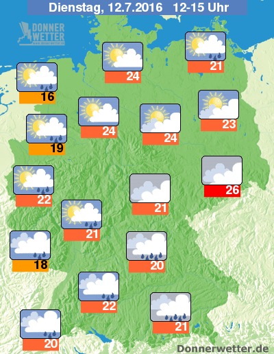 Heute Nachmittag zeigt sich im Norden und Westen neben zeitweise dichten Wolken auch die Sonne, jedoch bilden sich hier einzelne Schauer und auch mögliche Gewitter. Im übrigen Bundesgebiet ist es mehrheitlich bedeckt und im Süden fällt teils kräftiger und ergiebiger Regen. Im Osten bleibt es hingegen weitgehend trocken. Die Temperatur liegt bei 16 Grad in Ostfriesland und etwa 26 Grad in der Lausitz.