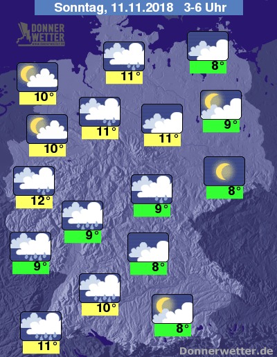 In der kommenden Nacht bleibt es in den östlichen Landesteilen bei oft aufgelockerter Bewölkung trocken. Im übrigen Bundesgebiet ist es mehrheitlich bedeckt und nur gebietsweise lockert es auch mal auf, dazu fällt zeitweise Regen. Die Temperatur sinkt auf 12 Grad in Köln und bis 8 Grad in Chemnitz.