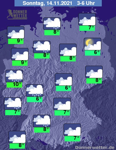 In der folgenden Nacht bleibt es über der Südwesthälfte Deutschlands weiterhin bedeckt und es fällt vielerorts Regen. Im Norden und Osten ist es meist stark, hin und wieder auch aufgelockert bewölkt, hier fällt nur selten ein wenig Regen. Stellenweise bildet sich Nebel. Die Temperatur sinkt auf 10 Grad in Köln und bis 6 Grad in Berlin.