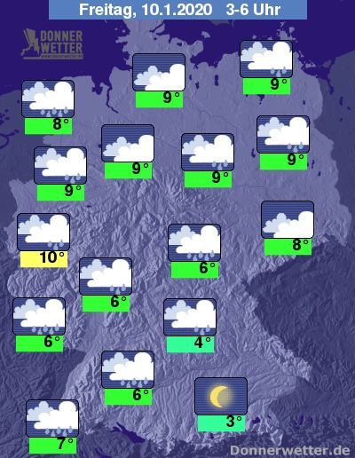 In der Nacht bleibt der Himmel über weiten Teilen des Landes bedeckt, dabei fällt verbreitet Regen, der vor allem im Westen und Südwesten zeitweise auch ergiebiger ausfallen kann. Überwiegend trocken bleibt es in den nächsten Stunden bei lockerer Bewölkung oder aufgeklartem Himmel nur am Alpenrand.