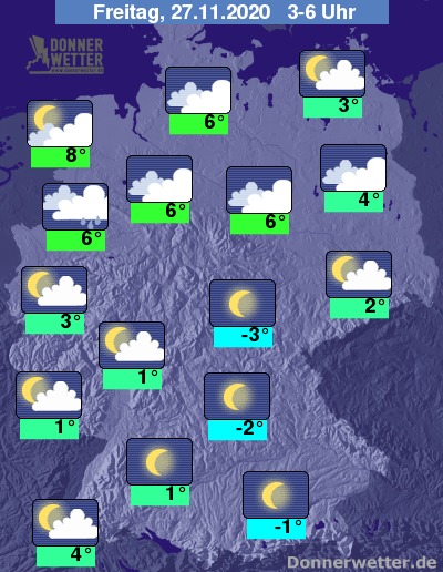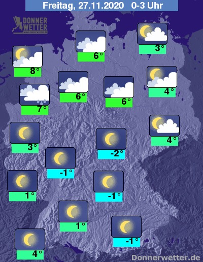 Bis zu den Frühstunden kühlt die Luft auf milde 8 Grad an der Nordseeküste und frostige -3 Grad im Frankenwald ab. Vornehmlich im Süden gibt es auch leichten Frost und die Gefahr von Reifglätte.