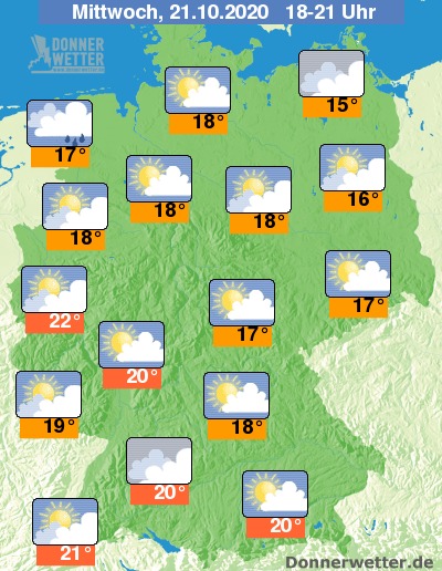 Am Abend kann es im Nordseeumfeld, sowie in Schleswig-Holstein noch etwas tröpfeln oder nieseln, im übrigen Land gestaltet sich der Himmel aufgeheitert bis bewölkt und teilweise kann man den Sonnenuntergang beobachten.