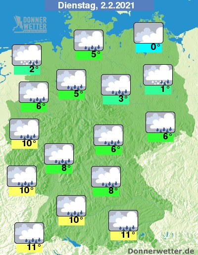 Am Dienstag bleibt es weitgehend bedeckt, dabei fält anfangs nur in den östlichsten und westlichsten Landesteilen gebietsweise Regen, im Osten auch zum Teil Schnee. Im Tagesverlauf setzt dann von Westen her Regen ein, im Norden und Nordosten fallen die Niederschläge häufig als Schnee. Die Temperatur steigt auf 0 Grad in Rostock und bis 11 Grad in Freiburg.