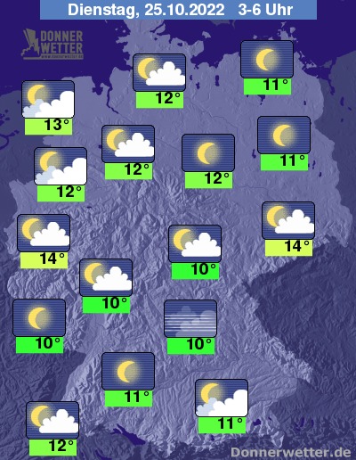 In der Nacht zum Dienstag klart der Himmel vielerorts auf, vor allem im Nordwesten und im Südosten bleibt es aber zumeist stark oder nur etwas aufgelockert bewölkt, hier sind vereinzelt Schauer möglich, während es sonst trocken bleibt. Stellenweise bildet sich Nebel. Die Temperatur sinkt auf 14 Grad in Köln und bis 10 Grad in Nürnberg.