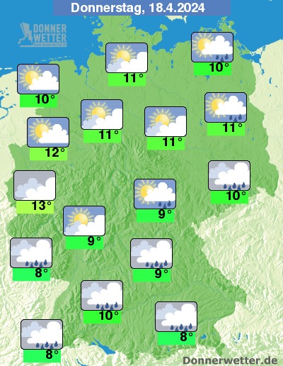 Am Donnerstag zeigt sich der Himmel in Küstennähe, im Südosten sowie südlich der Donau stark bewölkt und zeitweise muss mit Regen- oder Graupelschauern, im Bergland auch Schnee, gerechnet werden. Auch einzelne Gewitter sind möglich. In den übrigen Landesteilen überwieget wechselnde Bewölkung, teils sind auch größere Aufheiterungen möglich, und es bleibt meist trocken.