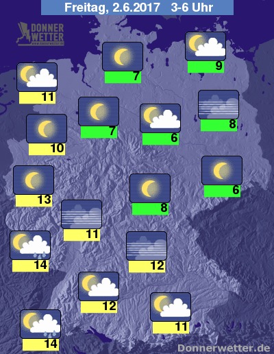 In der Nacht lassen Schauer und Gewitter dann nach, lediglich im Südwesten regnet es noch vereinzelt. Sonst bleibt der Himmel fast überall klar, nur stellenweise bildet sich gegen Morgen Nebel.