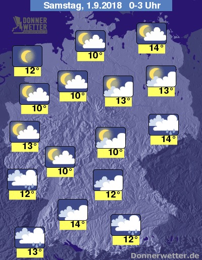 In der Nacht zeigt sich der Himmel in den meisten Landesteilen bewölkt, im Süden bleibt es zumeist bedeckt. Klare Himmelssicht gibt es meist nur entlang der Nordseeküste. In der Südhälfte muss regional mit Schauern gerechnet werden, sonst bleibt es überwiegend trocken.