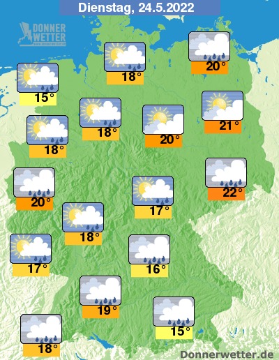 Heute zieht aufgelockerte oder starke Bewölkung durch, dabei bilden sich gebietsweise Schauer. Im Süden bleibt es mehrheitlich dicht bewölkt, dabei fällt gebietsweise Regen, Die Temperatur erreicht nur 15 Grad an der Nordsee und bis 22 Grad in der Lausitz.