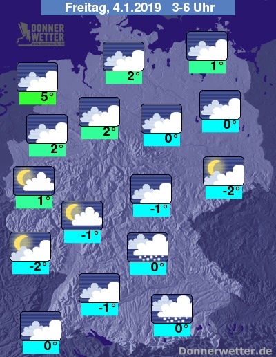 Der Freitag startet dann vor allem im südlichen NRW sowie über Rheinland-Pfalz mit örtlichen Auflockerungen, in den übrigen Landesteilen bleibt der Himmel meist stark bewölkt oder bedeckt. Entlang der Oder sowie in Bayern fällt regional Schneeregen oder Schnee, sonst bleibt es bei Höchstwerten um -2 bis 5 Grad C meist trocken.