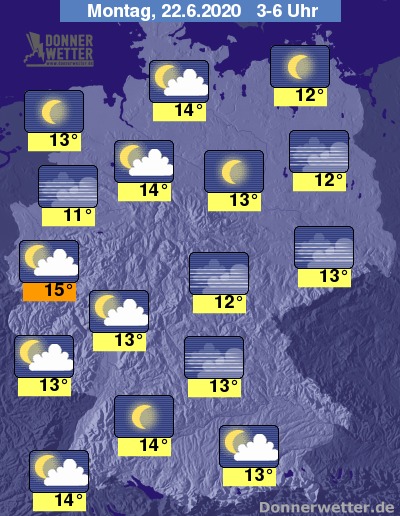 In der folgenden Nacht klingen letzte Schauer im Alpenvorland und an Rhein und Ems ab und der Himmel lockert mehr und mehr auf. In den übrigen Landesteilen ist es schon verbreitet sternenklar oder nur gering bewölkt und dazu trocken. Die Temperatur sinkt auf 15 Grad in der Kölner Bucht und bis 12 Grad an der Müritz.