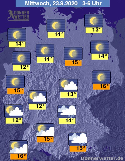 Auch während der zweiten Nachthälfte muss von den Alpen bis zum Bayerischen Wald mit örtlichen Regengüssen, vereinzelt auch in Begleitung von Blitz und Donner gerechnet werden. Sonst bleibt es trocken. Vor allem im Westen und Norden leuchten Mondsichel und Sterne von einem wolkenlosen Himmel.