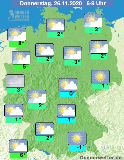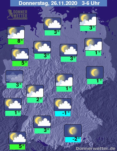 Bis zu den Frühstunden kühlt die Luft verbreitet auf 4 bis 1 Grad ab und es muss mit Reifglätte gerechnet werden, im Alpenvorland gibt es verbreitet leichten Frost bis -2 Grad. Am mildesten bleibt es im Breisgau sowie im Emsland mit Werten zwsichen 5 und 8 Grad.