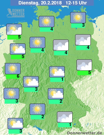 Im weiteren Nachmittagsverlauf gibt es vor allem in der Nord- und Westhälfte strahlenden Sonnenschein, im Süden ziehen ab und an auch mal lockere Wolken durch. Eine geschlossene Wolkendecke hält sich meist nur noch über dem Erzgebirge sowie dem Alpenrand.