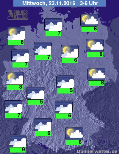 In der kommenden Nacht ziehen oft viele und auch dichte Wolken übers Land hinweg, dazwischen kann es bevorzugt über dem Südosten, Osten und Nordosten etwas auflockern. Nur im äußeren Südwesten ist hier und da Regen möglich, sonst bleibt es verbreitet trocken. Die Temperatur sinkt auf 9 bis 5 Grad.