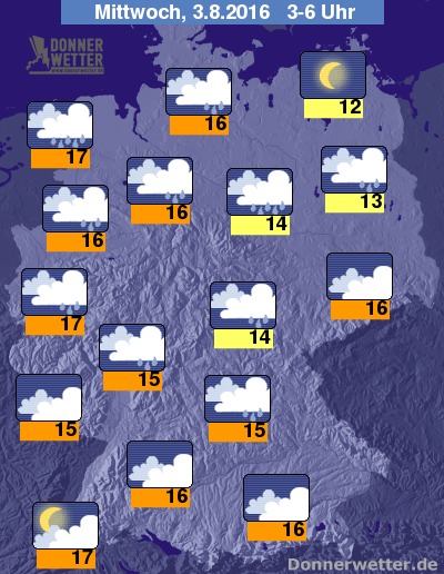 In der folgenden Nacht ist es im Norden und Osten anfangs noch meist locker oder aufgelockert bewölkt und trocken, im Nordosten auch noch sternenklar, sonst ziehen weitgehend dichte Wolken durch und es fällt zeitweise Regen. Zum Morgen hin breitet sich der Regen auch auf den Norden und Osten des Landes aus, während im Süden der Regen abklingt und der Himmel auflockert. Die Temperatur sinkt auf 17 Grad im Rheinland und etwa 12 Grad an der Müritz.