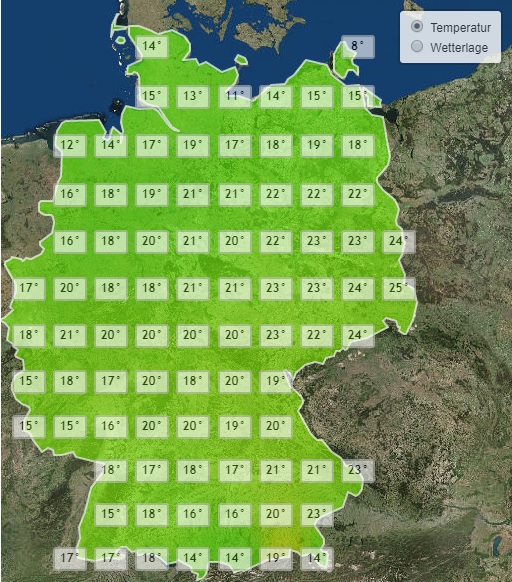 Am Nachmittag liegen die Höchsttemperaturen dann verbreitet bei Werten um die 20 Grad. Wesentlich kühler bleibt es vor allem an den Küsten und in den Mittelgebirgen des Südens. Im östlichen Sachsen sind hingegen bis zu 25 Grad möglich.