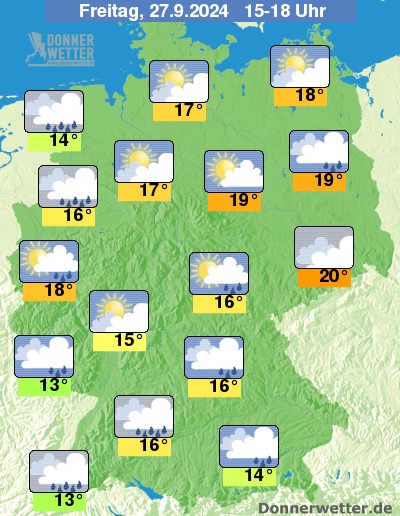 Am Freitagnachmittag zeigt sich der Himmel über weiten Landesteilen wechselnd oder stark bewölkt; dabei fällt in Küstennähe und im Nordwesten kräftiger Regen, im weiteren Verlauf in Schauer übergehend. Sonst ziehen in der Mitte und im Süden am Nachmitag Schauer und Gewitter auf, die am Abend auch den Südosten des Landes erreichen. Auch im Westen muss abends mit teils schauerartigem Regen gerechnet werden.