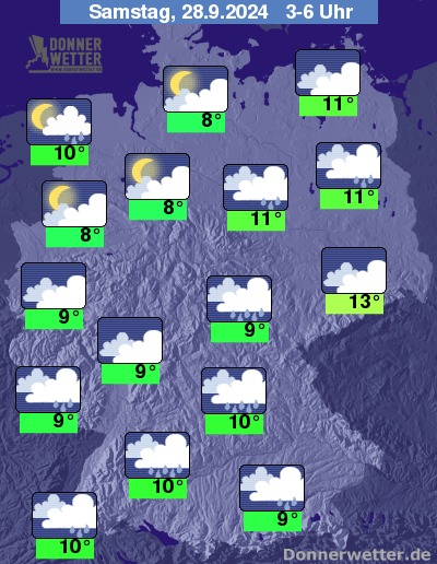 In der Nacht zum Samstag bleibt der Himmel über weiten Landesteilen stark bewölkt oder bedeckt und es fällt gebietsweise Regen. Anfangs muss lokal noch mit stürmischen Böen gerechnet werden, im Nachtverlauf nachlassender Wind. An den Küsten weiterhin Sturm oder schwerer Sturm.