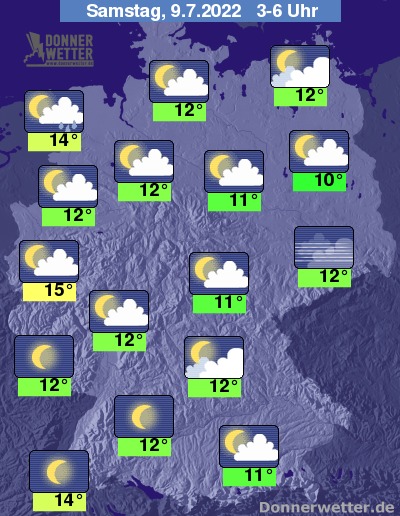 In der folgenden Nacht ist es im Land überwiegend nur locker bewölkt, im Südwesten ist es verbreitet sternenklar. Im Norden ist es anfangs noch meist locker bis wechselnd bewölkt, im Laufe der Nacht zieht es sich hier jedoch zu und es bilden sich auch einzelne Schauer. Im übrigen Land bleibt es trocken bei Tiefstwerten von 15 Grad in Bonn und 10 Grad in Potsdam.