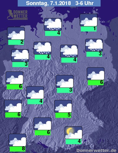 In der kommenden Nacht verdichten sich die Wolken auch im Süden, dazu bleibt es aber trocken. Im übrigen Land bleibt es weiterhin bedeckt und es fällt gebietsweise Regen, gegen Morgen im Norden teils auch Schneeregen oder Schnee, dazu besteht stellenweise Glättegefahr! Die Temperatur sinkt auf 8 Grad im Breisgau und bis 1 Grad in Vorpommern.