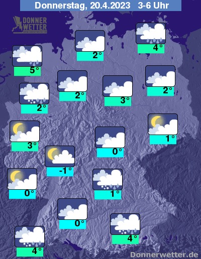 In der folgenden Nacht ziehen überwiegend dichte Wolken durch, die vor allem im Norden, aber auch im Süden vielerorts Regen, zum Teil auch Schneeregen oder Schnee bringen. Oft locker bis aufgelockert bewölkt bleibt es hingegen vom Südwesten in einem Streifen bis nach Sachsen, hier bleibt es auch weitgehend trocken. Die Temperatur sinkt auf 5 Grad in Cuxhaven und bis -1 Grad in Wiesbaden.