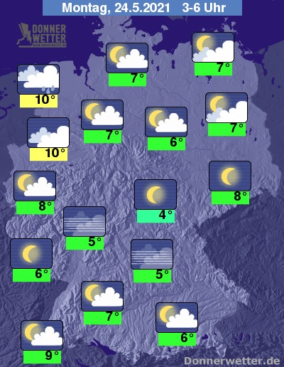 In der bevorstehenden Nacht zeigt sich der Himmel im Süden, der Mitte des Landes und im Osten oft sternenklar, sonst ist es meist locker bis aufgelockert bewölkt. Vom Emsland bis rund um die Nordsee halten sich dichte Wolken. An der Nordsee bilden sich einzelne Schauer, im übrigen Land bleibt es jedoch trocken. Die Temperatur sinkt auf 10 Grad entlang der Ems und bis 4 Grad im Vogtland.