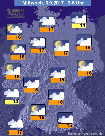 In der folgenden Nacht ziehen überwiegend dichte Wolken übers Land hinweg, dazu fällt vor allem im Norden, aber auch in den westlichen Landesteilen zeitweise Regen, sonst bleibt es zumeist trocken. Die Temperatur sinkt auf 18 Grad in Köln und bis 14 Grad am Pfälzer Wald.