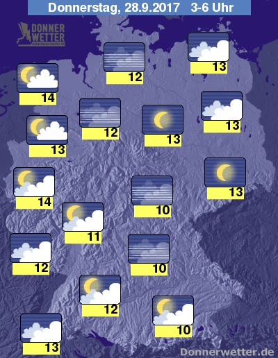 In der folgenden Nacht ziehen dichte Wolken über den Nordosten und ab der zweiten Nachthälfte auch über den Südwesten und den Westen hinweg, dazu bleibt es meist trocken, sonst ist der Himmel verbreitet sternenklar oder locker bewölkt und es bleibt trocken. Die Temperatur sinkt auf 14 Grad in Bonn und bis 10 Grad in Mittelfranken.
