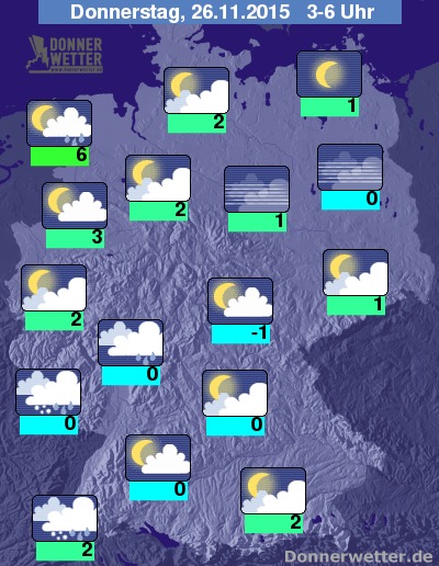 In der kommenden Nacht zeigt sich der Himmel über dem Norden und Westen meist wechselnd, teils stark bewölkt, dabei ist es weitgehend trocken. Im Nordosten ist es oft sternenklar und dazu trocken. Über der Südosthälfte des Landes ist es überwiegend stark bewölkt, dazu fällt in einem breiten Streifen vom Schwarzwald zum Saarland und weiter bis nach Hessen zeitweise Regen, Schneeregen oder Schnee mit möglicher Glättegefahr! Sonst ist es zumeist trocken. Die Temperatur sinkt auf 6 Grad an der Nordsee und bis auf frostige -1 Grad im Vogtland.
